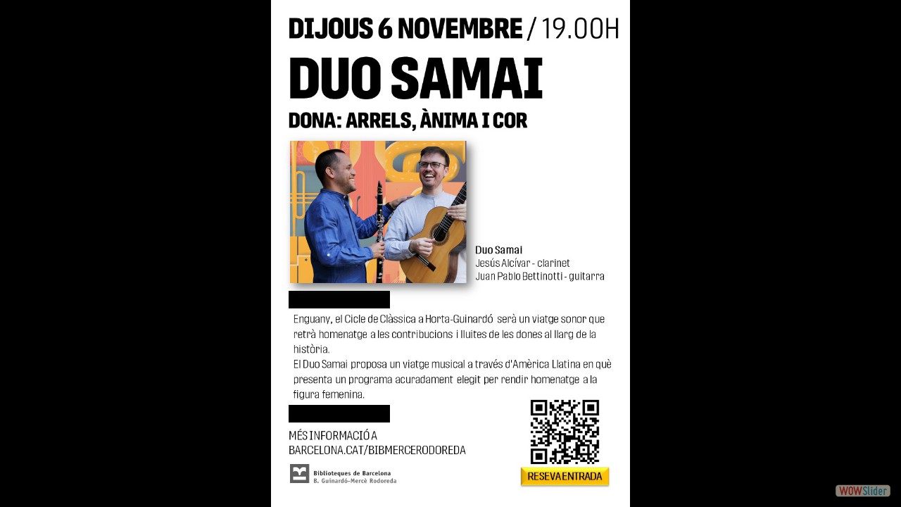 A wonderful concert by the SAMAI Duo at the Mercè Rodoreda Library as part of the Horta-Guinardó Classical Music Festival! Many thanks to Laia Camps for the invitation and organization.